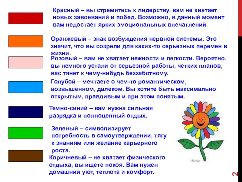 Коричневый – не хватает физического отдыха, вы ищете покоя. Вам нужен домашний уют, теплота и комфорт.