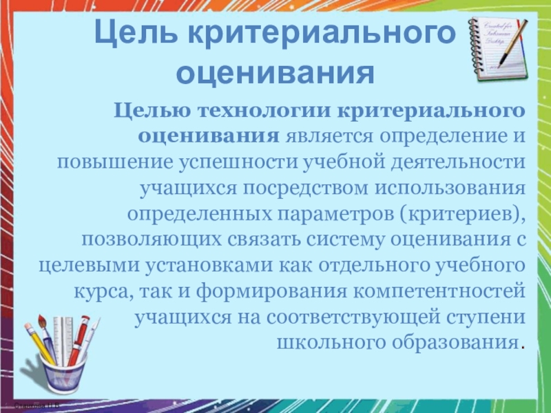 Слайд 5Целью технологии критериального оценивания является определение и повышение успешности учебной деятельности