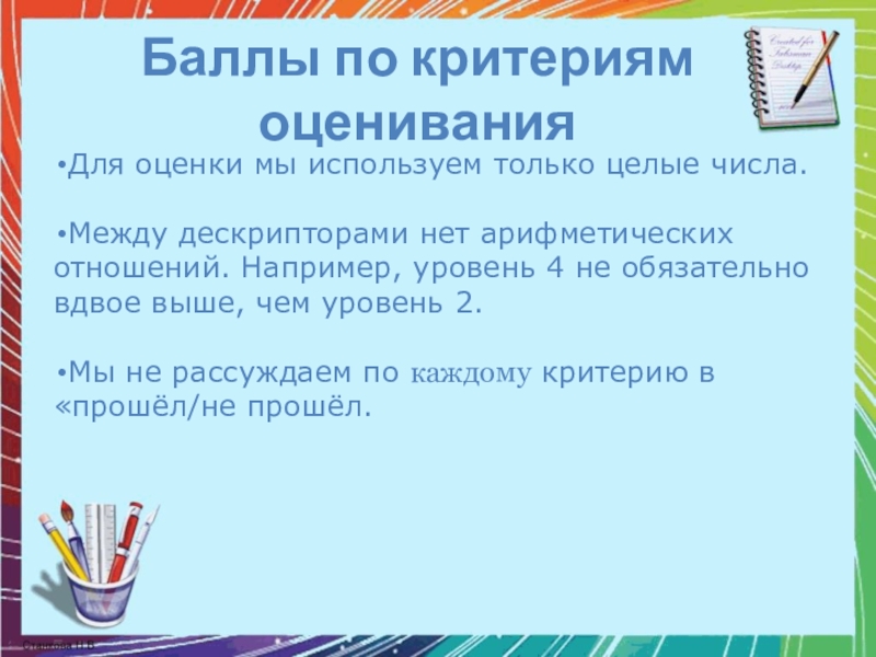 по другим критериям. И наоборот, ученик, который получил низший уровень по одному критерию, не обязательно получит его по другим критериям.