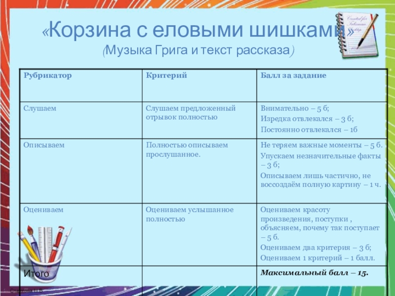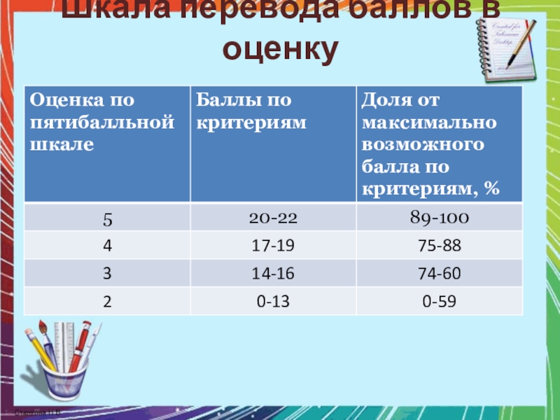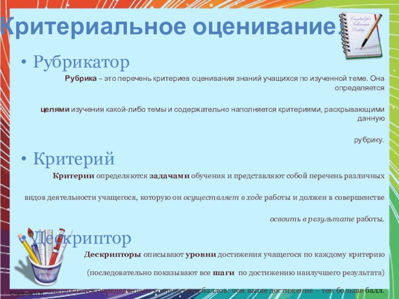 Рубрика – это перечень критериев оценивания знаний учащихся