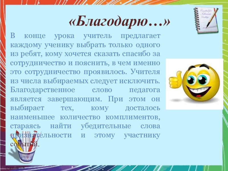 из ребят, кому хочется сказать спасибо за сотрудничество и пояснить, в чем именно это сотрудничество проявилось. Учителя из числа выбираемых следует исключить. Благодарственное слово педагога является завершающим. При этом он выбирает тех, кому досталось наименьшее количество комплиментов, стараясь найти убедительные слова признательности и этому участнику событий.