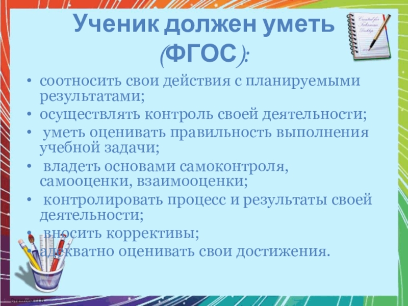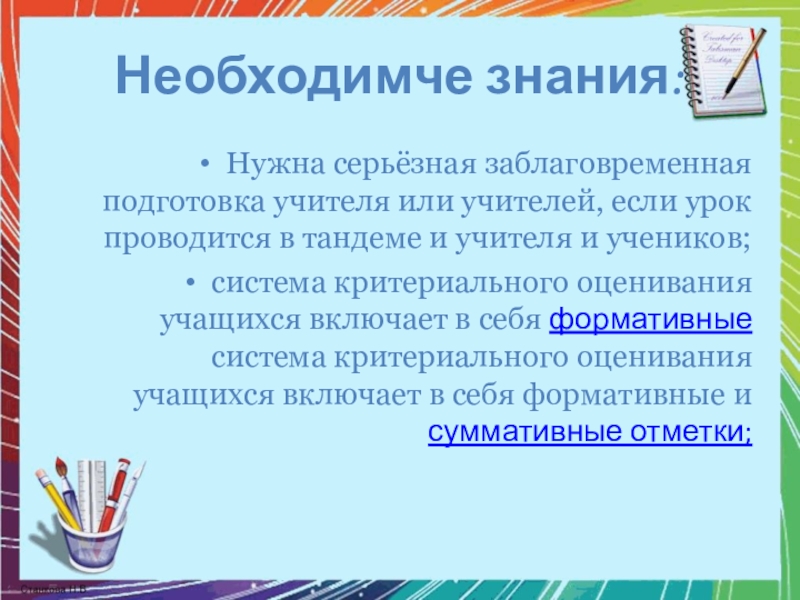 с четко определенными, коллективно выработанными, заранее известными всем участникам процесса критериями, соответствующими целям и содержанию образования, способствующими формированию учебно-познавательной компетентности учащихся.