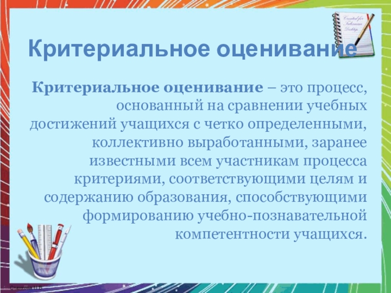 Слайд 4Критериальное оценивание – это процесс, основанный на сравнении учебных достижений учащихся