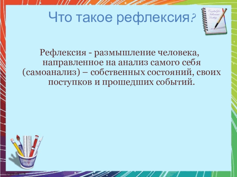 себя (самоанализ) – собственных состояний, своих поступков и прошедших событий.