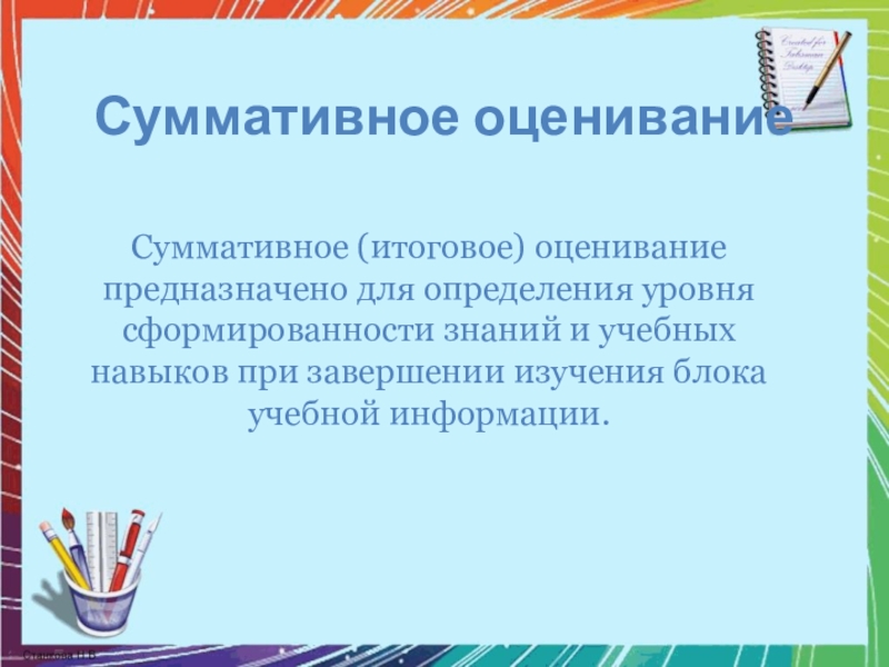 Суммативное (итоговое) оценивание предназначено для определения уровня сформированности знаний и учебных
