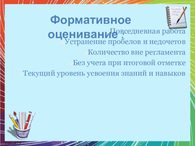 система критериального оценивания учащихся включает в себя формативные система критериального оценивания учащихся включает в себя формативные и суммативные отметки;