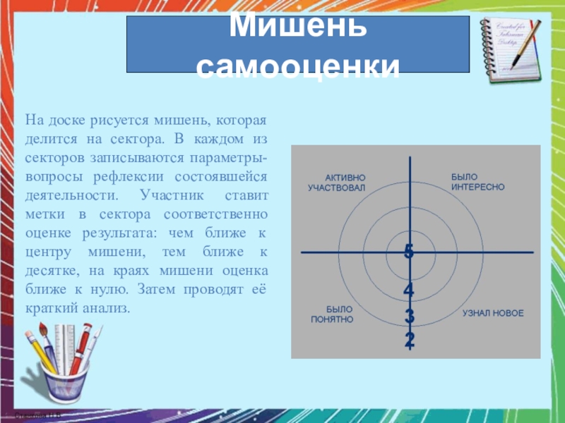каждом из секторов записываются параметры- вопросы рефлексии состоявшейся деятельности. Участник ставит метки в сектора соответственно оценке результата: чем ближе к центру мишени, тем ближе к десятке, на краях мишени оценка ближе к нулю. Затем проводят её краткий анализ.