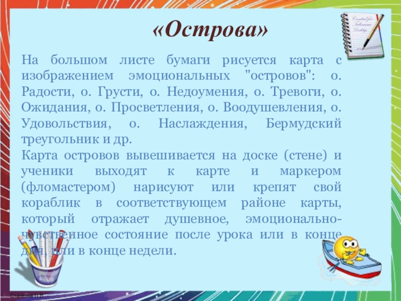 Карта островов вывешивается на доске (стене) и ученики выходят к карте и маркером (фломастером) нарисуют или крепят свой кораблик в соответствующем районе карты, который отражает душевное, эмоционально-чувственное состояние после урока или в конце дня, или в конце недели.