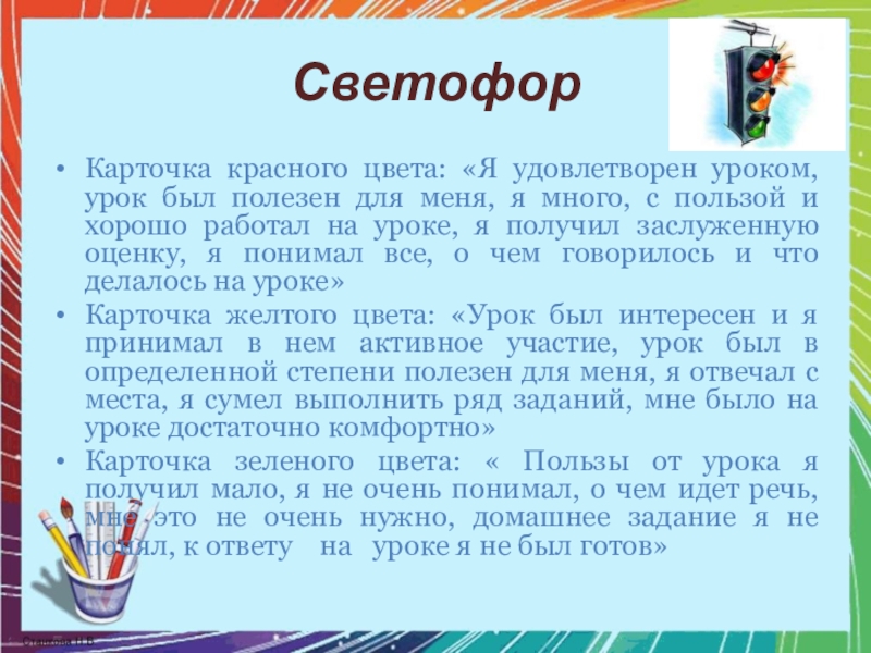 Карточка зеленого цвета: « Пользы от урока я получил мало, я не очень понимал, о чем идет речь, мне это не очень нужно, домашнее задание я не понял, к ответу на уроке я не был готов»