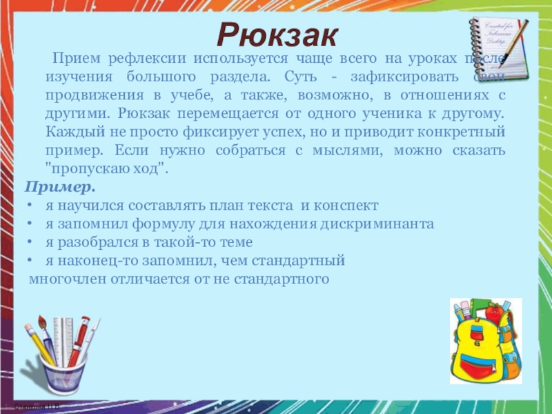большого раздела. Суть - зафиксировать свои продвижения в учебе, а также, возможно, в отношениях с другими. Рюкзак перемещается от одного ученика к другому. Каждый не просто фиксирует успех, но и приводит конкретный пример. Если нужно собраться с мыслями, можно сказать "пропускаю ход".