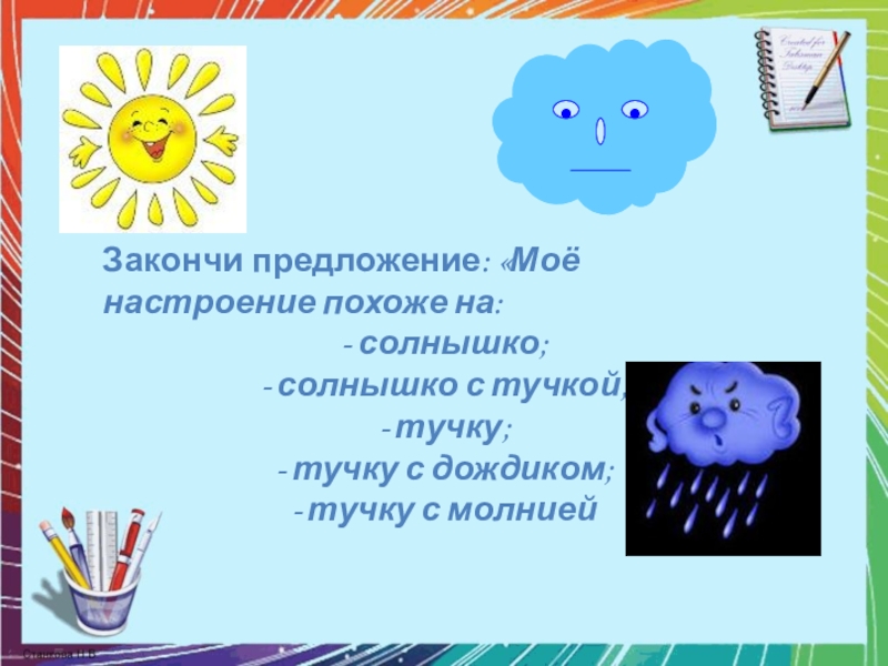 Слайд 20Закончи предложение: «Моё настроение похоже на: