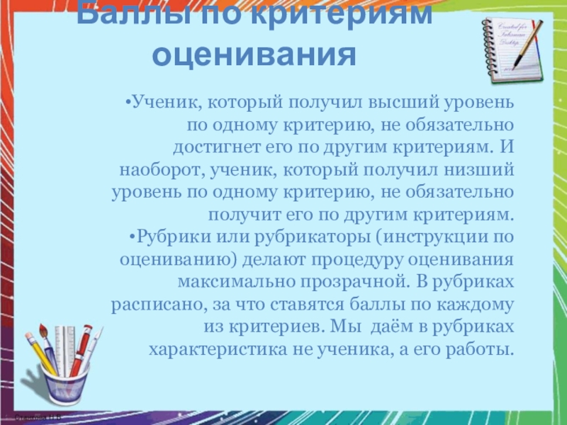 Рубрики или рубрикаторы (инструкции по оцениванию) делают процедуру оценивания максимально прозрачной. В рубриках расписано, за что ставятся баллы по каждому из критериев. Мы даём в рубриках характеристика не ученика, а его работы.