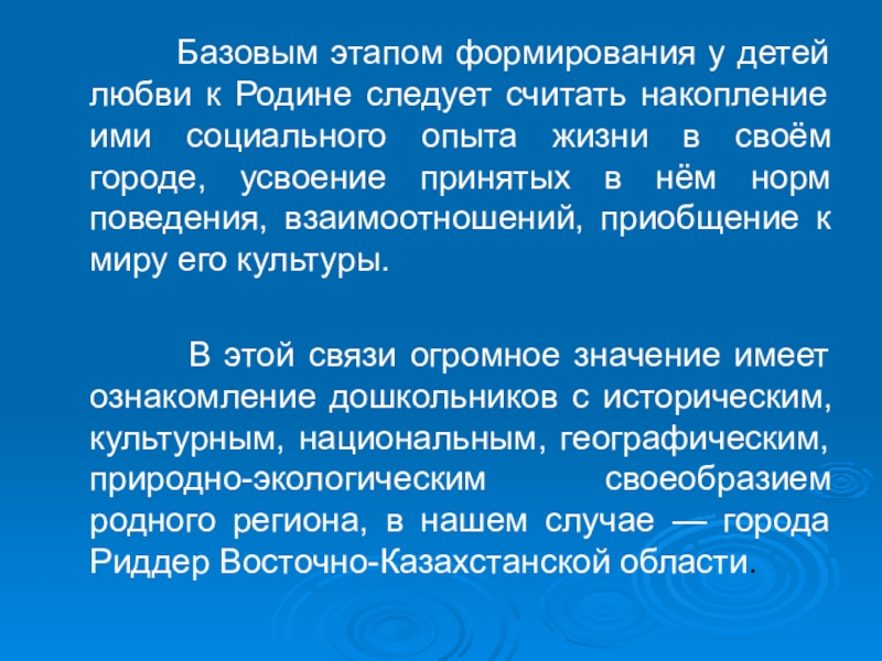 В этой связи огромное значение имеет ознакомление дошкольников с историческим, культурным, национальным, географическим, природно-экологическим своеобразием родного региона, в нашем случае — города Риддер Восточно-Казахстанской области.