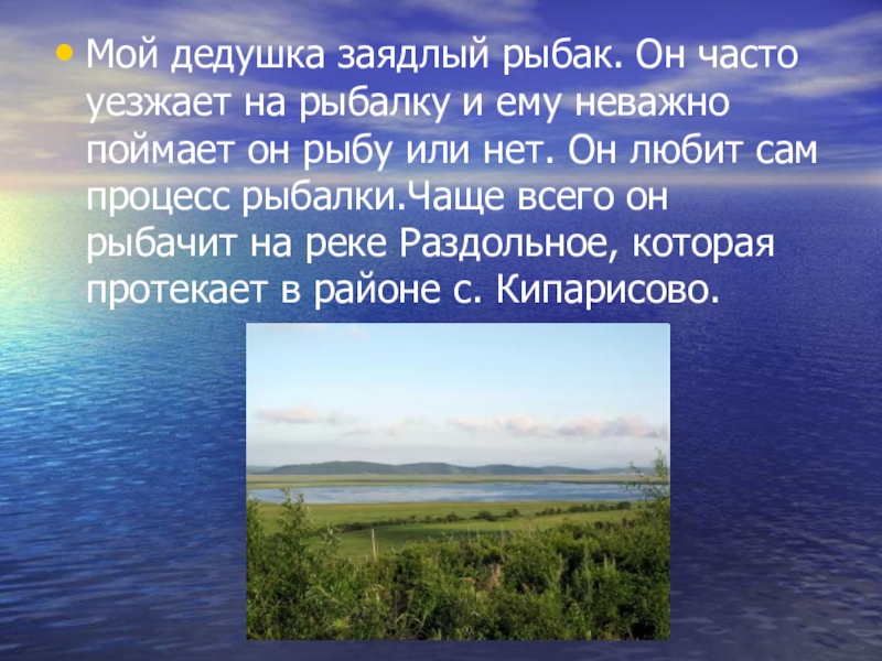неважно поймает он рыбу или нет. Он любит сам процесс рыбалки.Чаще всего он рыбачит на реке Раздольное, которая протекает в районе с. Кипарисово.