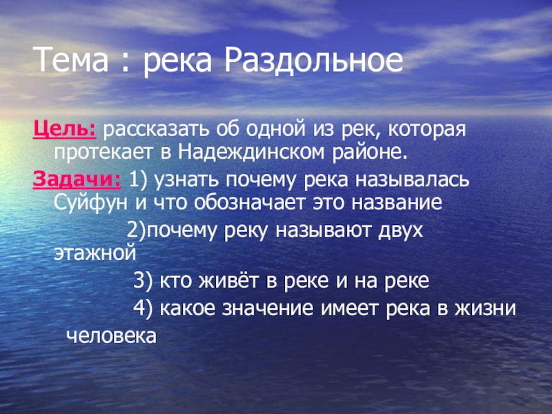 Слайд 2Тема : река Раздольное