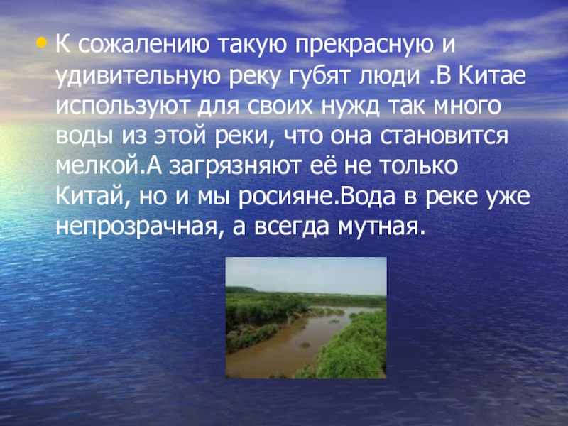 используют для своих нужд так много воды из этой реки, что она становится мелкой.А загрязняют её не только Китай, но и мы росияне.Вода в реке уже непрозрачная, а всегда мутная.