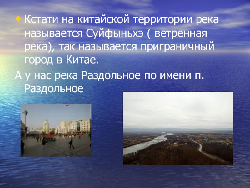 Кстати на китайской территории река называется Суйфыньхэ ( ветренная река), так