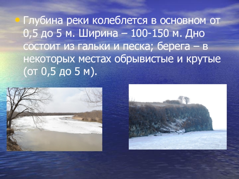 – 100-150 м. Дно состоит из гальки и песка; берега – в некоторых местах обрывистые и крутые (от 0,5 до 5 м).