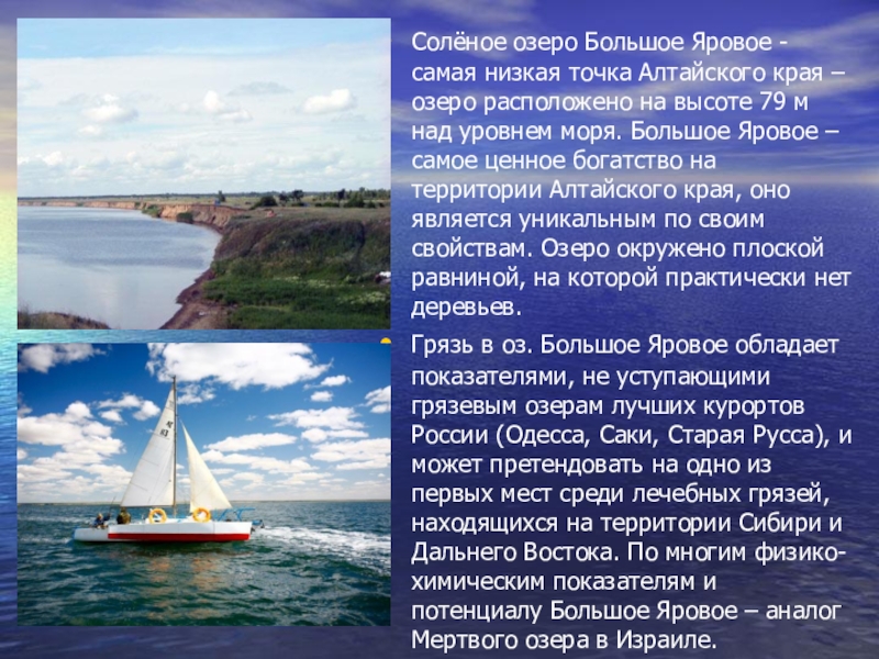 Грязь в оз. Большое Яровое обладает показателями, не уступающими грязевым озерам лучших курортов России (Одесса, Саки, Старая Русса), и может претендовать на одно из первых мест среди лечебных грязей, находящихся на территории Сибири и Дальнего Востока. По многим физико-химическим показателям и потенциалу Большое Яровое – аналог Мертвого озера в Израиле.