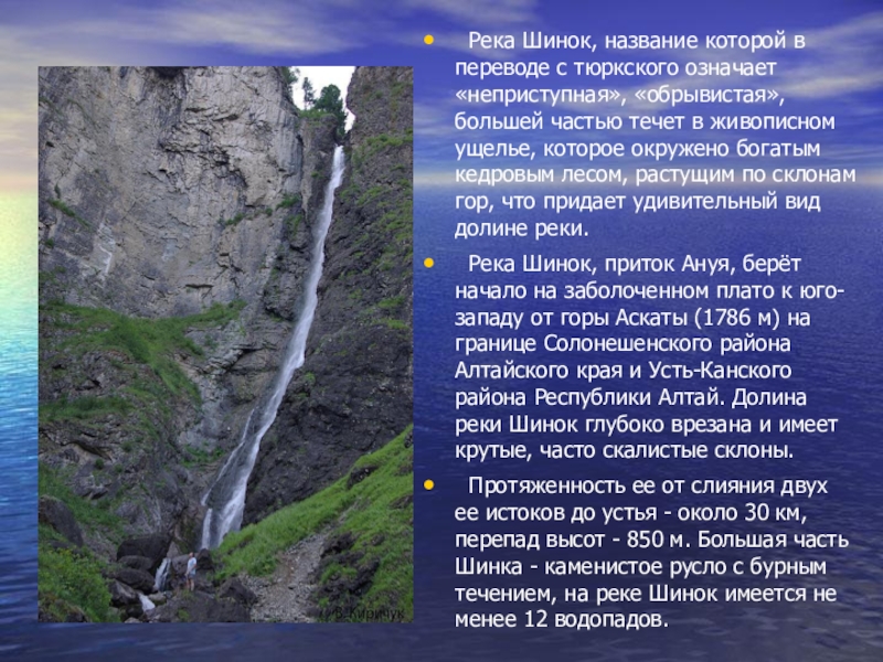 Протяженность ее от слияния двух ее истоков до устья - около 30 км, перепад высот - 850 м. Большая часть Шинка - каменистое русло с бурным течением, на реке Шинок имеется не менее 12 водопадов.