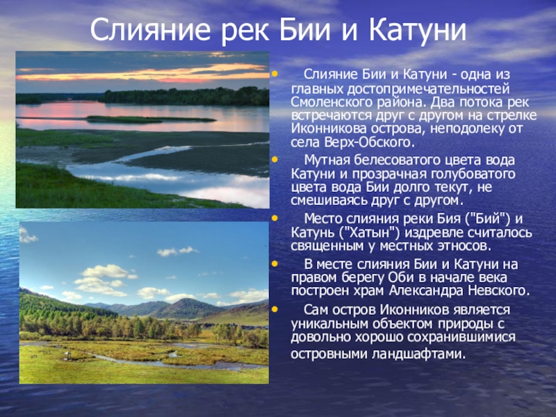 В месте слияния Бии и Катуни на правом берегу Оби в начале века построен храм Александра Невского.