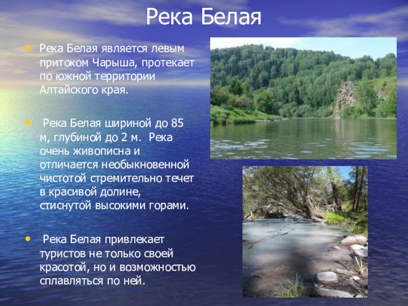 Река Белая является левым притоком Чарыша, протекает по южной территории