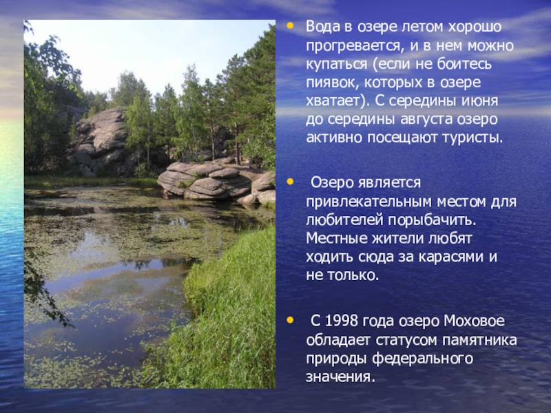 (если не боитесь пиявок, которых в озере хватает). С середины июня до середины августа озеро активно посещают туристы.