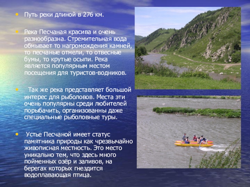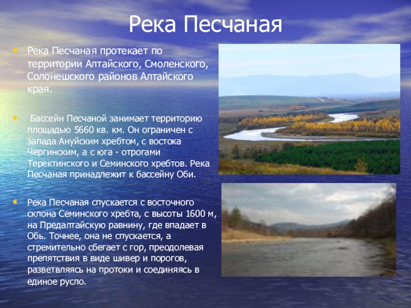 Река Песчаная спускается с восточного склона Семинского хребта, с высоты 1600 м, на Предалтайскую равнину, где впадает в Обь. Точнее, она не спускается, а стремительно сбегает с гор, преодолевая препятствия в виде шивер и порогов, разветвляясь на протоки и соединяясь в единое русло.