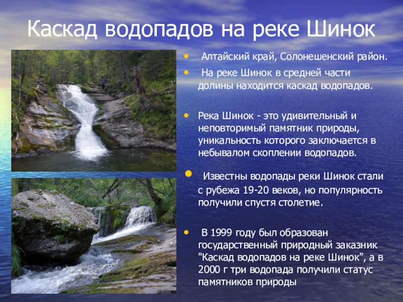 В 1999 году был образован государственный природный заказник "Каскад водопадов на реке Шинок", а в 2000 г три водопада получили статус памятников природы
