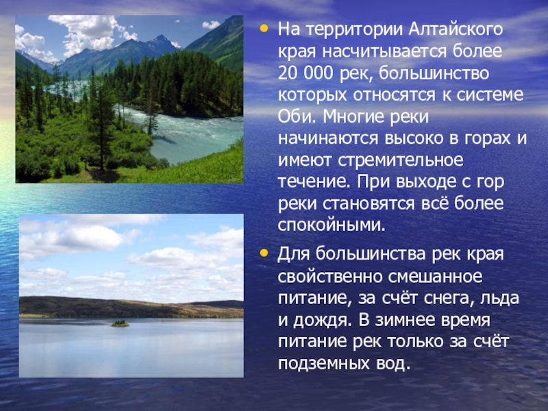 относятся к системе Оби. Многие реки начинаются высоко в горах и имеют стремительное течение. При выходе с гор реки становятся всё более спокойными.
