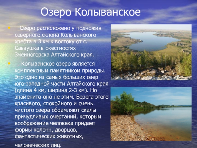 Колыванское озеро является комплексным памятником природы. Это одно из самых больших озер юго-западной части Алтайского края (длина 4 км, ширина 2-3 км). Но знаменито оно не этим. Берега этого красивого, спокойного и очень чистого озера обрамляют скалы причудливых очертаний, которым воображение человека придает формы колонн, дворцов, фантастических животных, человеческих лиц.