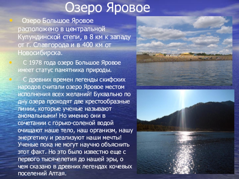 С древних времен легенды скифских народов считали озеро Яровое местом исполнения всех желаний! Буквально по дну озера проходят две крестообразные линии, которые ученые называют аномальными! Но именно они в сочетании с горько-соленой водой очищают наше тело, наш организм, нашу энергетику и реализуют наши мечты! Ученые пока не могут научно объяснить этот факт. Но это было известно еще с первого тысячелетия до нашей эры, о чем сказано в древних легендах кочевых поселений Алтая.