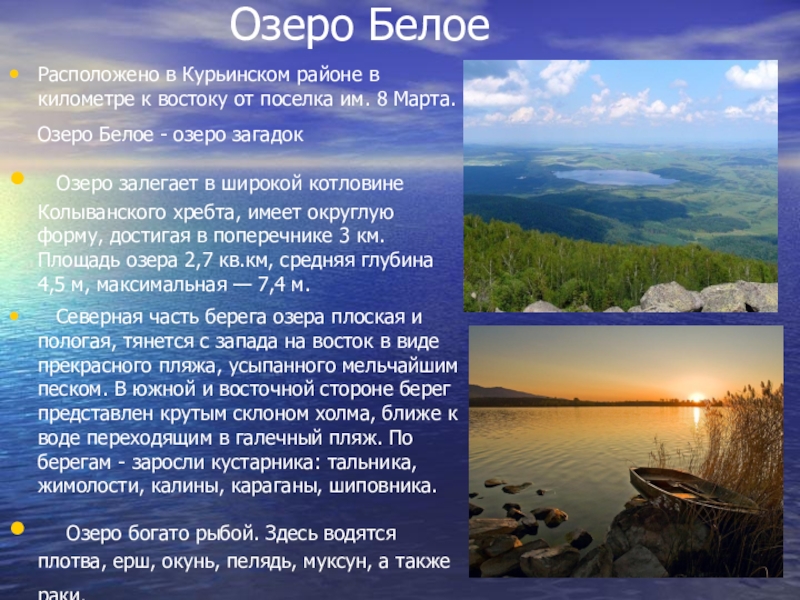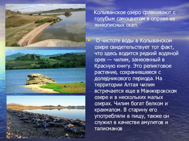 Большая часть озер находится в Кулундинской низменности и на Приобском плато. Недаром Алтай называют краем голубых озер. Небольшие по размеру горные и степные озера придают природным ландшафтам своеобразное очарование и неповторимость.