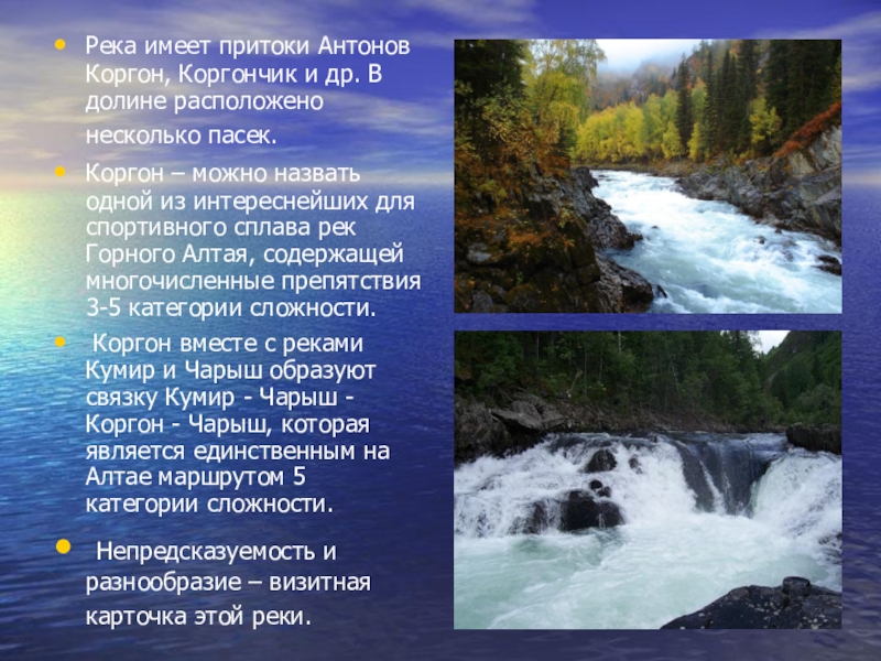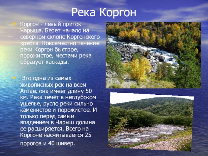 Это одна из самых живописных рек на всем Алтае, она имеет длину 50 км. Река течет в неглубоком ущелье, русло реки сильно каменистое и порожистое. И только перед самым впадением в Чарыш долина ее расширяется. Всего на Коргоне насчитывается 25 порогов и 40 шивер.