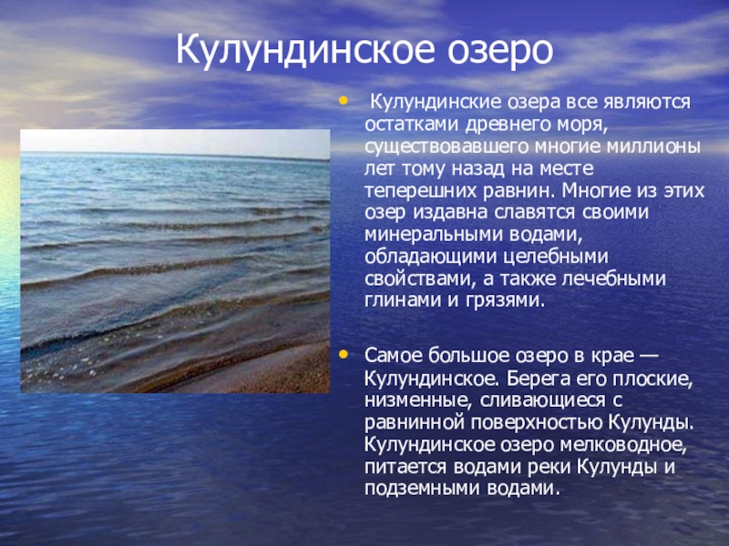 Самое большое озеро в крае — Кулундинское. Берега его плоские, низменные, сливающиеся с равнинной поверхностью Кулунды. Кулундинское озеро мелководное, питается водами реки Кулунды и подземными водами.