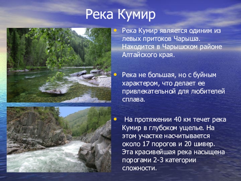 На протяжении 40 км течет река Кумир в глубоком ущелье. На этом участке насчитывается около 17 порогов и 20 шивер. Эта красивейшая река насыщена порогами 2-3 категории сложности.