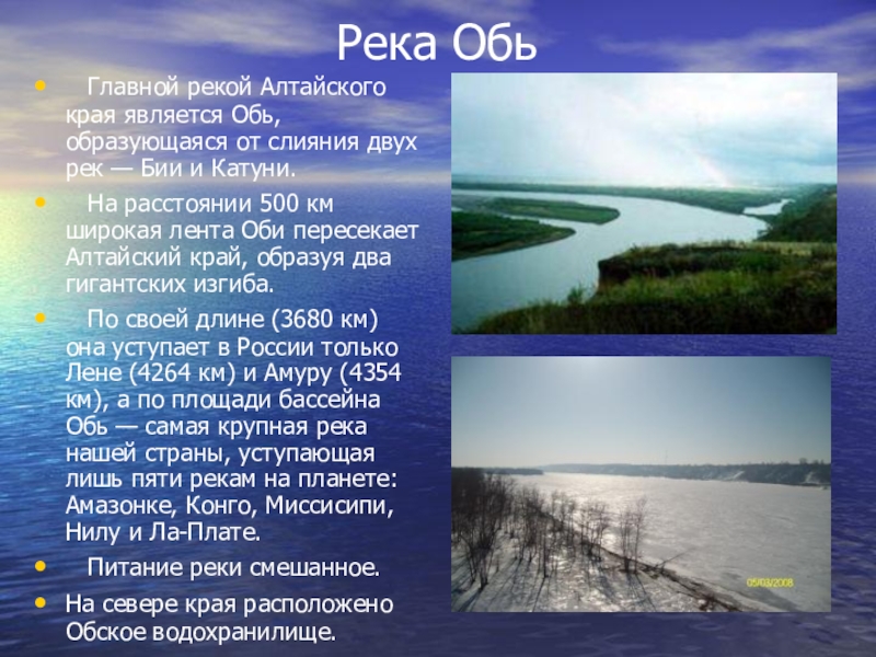 По своей длине (3680 км) она уступает в России только Лене (4264 км) и Амуру (4354 км), а по площади бассейна Обь — самая крупная река нашей страны, уступающая лишь пяти рекам на планете: Амазонке, Конго, Миссисипи, Нилу и Ла-Плате.