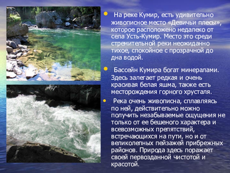 На реке Кумир, есть удивительно живописное место «Девичьи плесы», которое