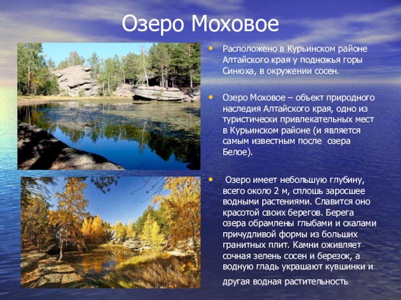 Озеро Моховое – объект природного наследия Алтайского края, одно из туристически привлекательных мест в Курьинском районе (и является самым известным после озера Белое).