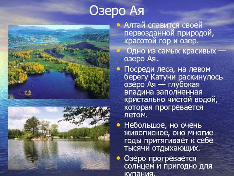Посреди леса, на левом берегу Катуни раскинулось озеро Ая — глубокая впадина заполненная кристально чистой водой, которая прогревается летом.