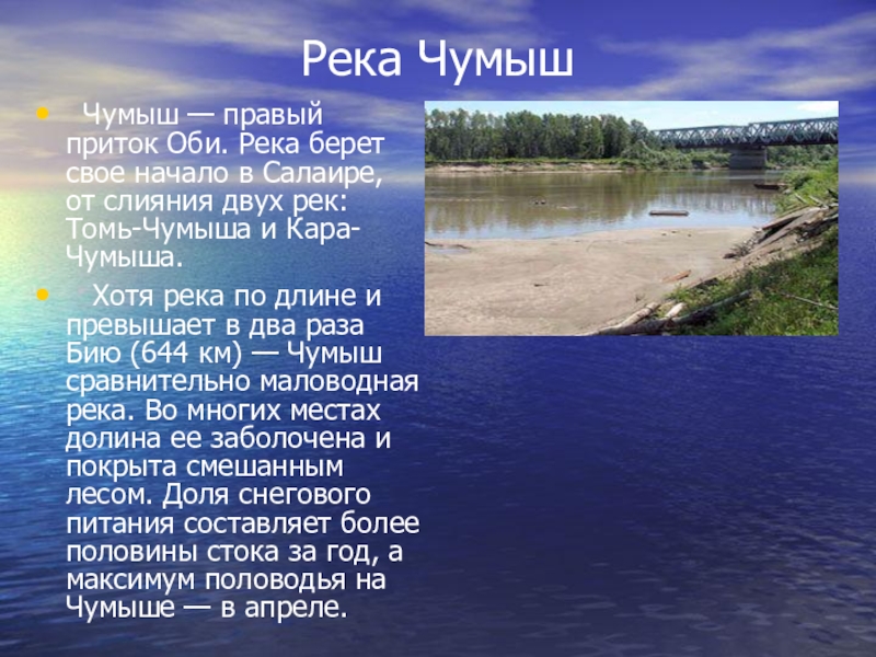 Хотя река по длине и превышает в два раза Бию (644 км) — Чумыш сравнительно маловодная река. Во многих местах долина ее заболочена и покрыта смешанным лесом. Доля снегового питания составляет более половины стока за год, а максимум половодья на Чумыше — в апреле.