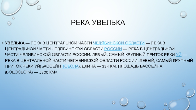 РЕКА УВЕЛЬКАУВЕ́ЛЬКА — РЕКА В ЦЕНТРАЛЬНОЙ ЧАСТИ ЧЕЛЯБИНСКОЙ ОБЛАСТИ — РЕКА В ЦЕНТРАЛЬНОЙ ЧАСТИ ЧЕЛЯБИНСКОЙ ОБЛАСТИ РОССИИ — РЕКА В ЦЕНТРАЛЬНОЙ ЧАСТИ ЧЕЛЯБИНСКОЙ ОБЛАСТИ РОССИИ.