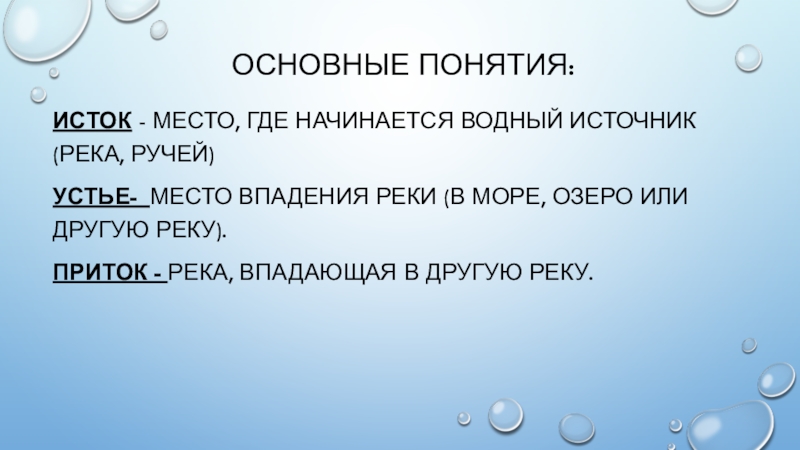 ОСНОВНЫЕ ПОНЯТИЯ:ИСТОК - МЕСТО, ГДЕ НАЧИНАЕТСЯ ВОДНЫЙ ИСТОЧНИК (РЕКА, РУЧЕЙ)УСТЬЕ- МЕСТО ВПАДЕНИЯ РЕКИ (В МОРЕ, ОЗЕРО ИЛИ