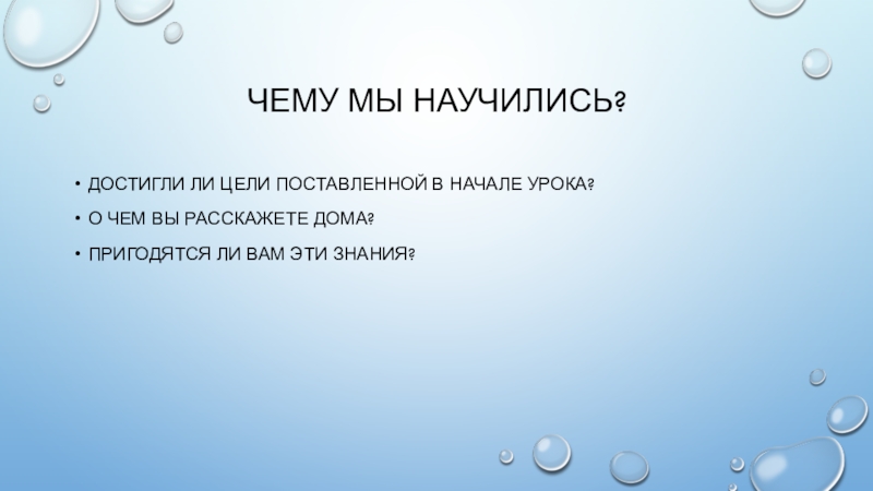 ЧЕМУ МЫ НАУЧИЛИСЬ?ДОСТИГЛИ ЛИ ЦЕЛИ ПОСТАВЛЕННОЙ В НАЧАЛЕ УРОКА?О ЧЕМ ВЫ РАССКАЖЕТЕ ДОМА?ПРИГОДЯТСЯ ЛИ ВАМ ЭТИ ЗНАНИЯ?