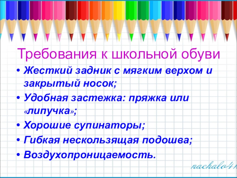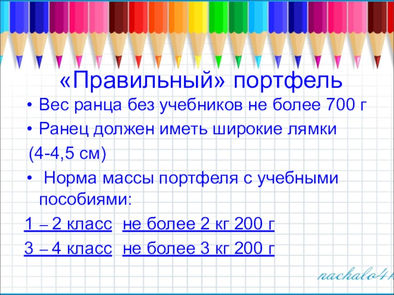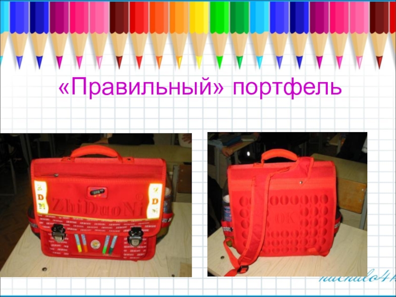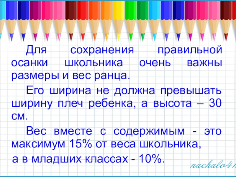 Слайд 12 Для сохранения правильной осанки школьника очень важны размеры и вес ранца.
