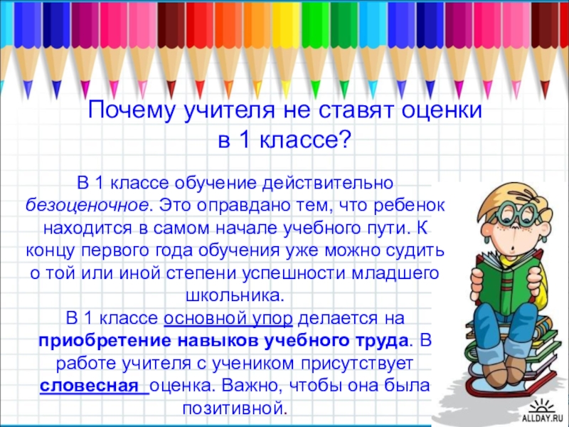 В 1 классе основной упор делается на приобретение навыков учебного труда. В работе учителя с учеником присутствует словесная оценка. Важно, чтобы она была позитивной.
