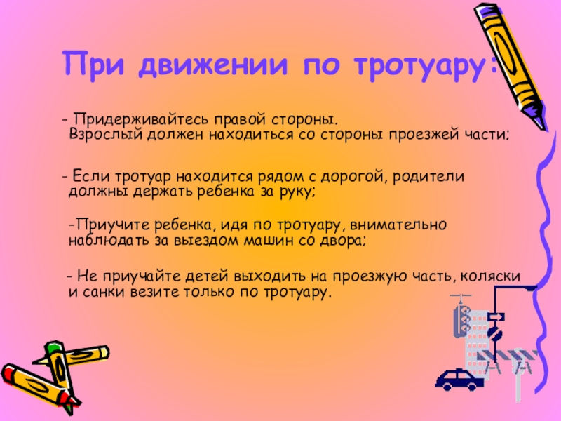 Объясните ребенку, что даже на дороге, где мало машин, переходить надо осторожно, так как машина может выехать со двора, из переулка