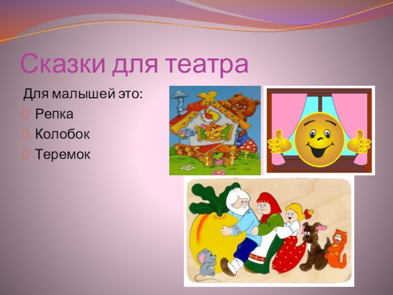 Сказки для театраДля малышей это:РепкаКолобокТеремок