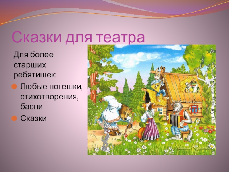 Сказки для театраДля более старших ребятишек:Любые потешки, стихотворения, басниСказки