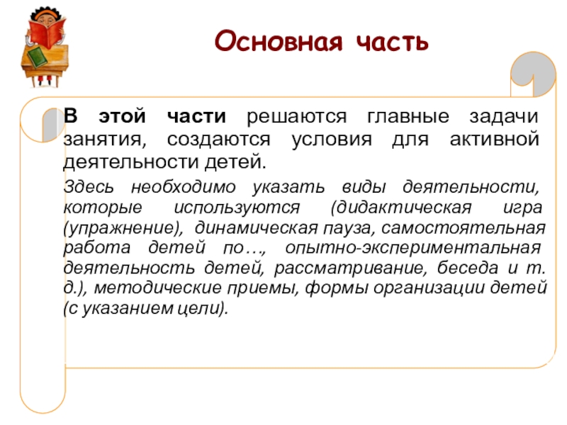 Здесь необходимо указать виды деятельности, которые используются (дидактическая игра (упражнение), динамическая пауза, самостоятельная работа детей по…, опытно-экспериментальная деятельность детей, рассматривание, беседа и т.д.), методические приемы, формы организации детей (с указанием цели).